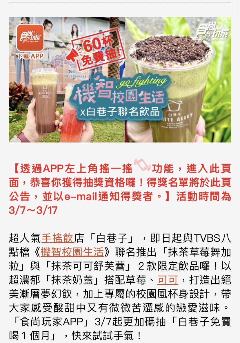 食尚玩家 X 白巷子加碼抽「夢幻漸層飲免費喝1個月」